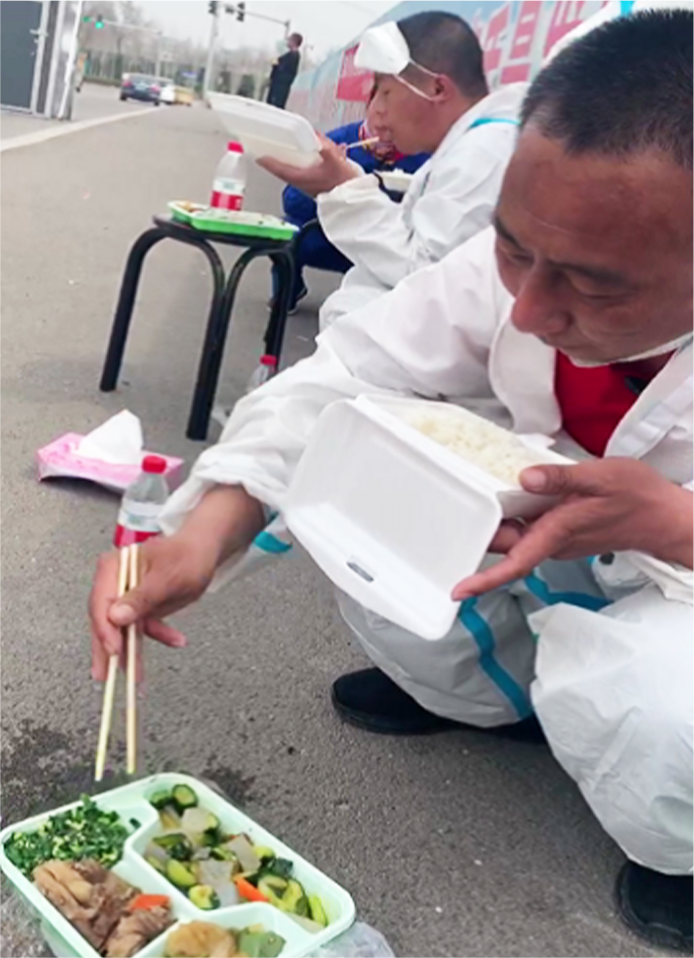 防疫專班人員秉承寧可十防九空,不可失防萬一的思想,吃住在公司,累了就在現(xiàn)場打個(gè)盹,餓了路面就是他們的“餐桌”,最晚接送車工作持續(xù)到凌晨2點(diǎn),第二天依舊準(zhǔn)時(shí)到崗。即便如此,他們的臉上依舊面帶笑容,口上說道:“只要能讓公司正常運(yùn)轉(zhuǎn)再苦再難也值了!”